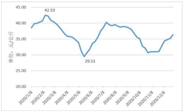 2020年1月至12月活豬平均價格走勢(浙江省畜牧農(nóng)機發(fā)展中心資料)