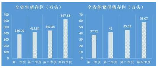 一、二、三季度,全省生豬存欄分別為386.09、419.84和447.85萬頭;四季度全省各地生豬產(chǎn)能快速提升,至四季度(即年末)全省生豬存欄達627.58萬頭,比上年同期增加200.28萬頭,同比增長46.9%。一、二、三季度全省能繁母豬存欄分別為37.52、42.00和45.58萬頭;至四季度(即年末)全省能繁母豬存欄為58.07萬頭,比上年同期增加17.87萬頭,同比增長44.5%。