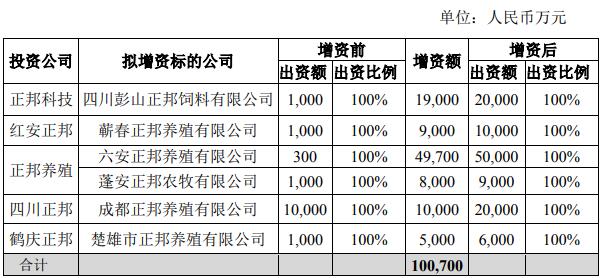 正邦科技1月30日發(fā)布公告,公司及公司子公司紅安正邦、正邦養(yǎng)殖、四川正邦、鶴慶正邦對6家子公司增資合計(jì)100,700萬元。具體情況如下: