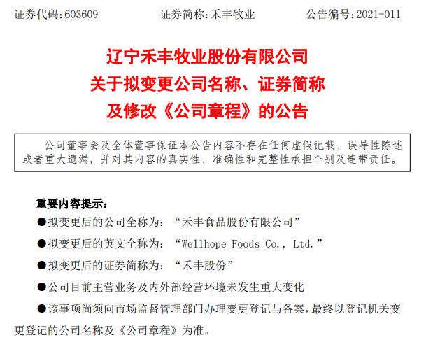 禾豐牧業(yè)對(duì)此解釋稱,鑒于公司所從事的飼料加工、屠宰及肉類加工業(yè)務(wù)為農(nóng)副食品加工業(yè),且公司制定了進(jìn)一步向食品深加工領(lǐng)域發(fā)展的經(jīng)營戰(zhàn)略,為進(jìn)一步契合行業(yè)分類及公司長遠(yuǎn)戰(zhàn)略發(fā)展需要,使公司名稱與公司定位、戰(zhàn)略規(guī)劃相匹配,公司擬變更公司名稱及證券簡稱,并對(duì)《公司章程》中相應(yīng)條款進(jìn)行修改。