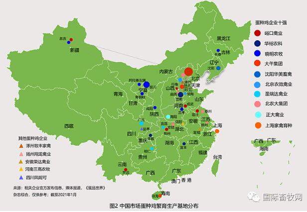 綜合中國農(nóng)業(yè)部種畜禽許可管理系統(tǒng)及企業(yè)官方發(fā)布的數(shù)據(jù)來看:目前,全國共有種蛋雞場734家,其中原種/祖代場33家,祖代場46家,父母代場655家。整體來看,種蛋雞場主要分布在北方且聚集在東部,以北京、河北、江蘇、安徽、山東、四川、湖北以及東北三省較多(見圖3)。