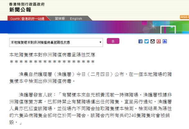漁護(hù)署發(fā)言人說:“有關(guān)樣本來自元朗黃泥墩一持牌豬場。漁護(hù)署根據(jù)非洲豬瘟應(yīng)變方案,已即時(shí)禁止有關(guān)豬場運(yùn)出任何豬只,直至另行通知。漁護(hù)署人員亦已巡查該豬場,并從場內(nèi)不同豬舍抽取豬只樣本檢測。檢測結(jié)果為陽性的六只染病豬只全部均位于同一豬舍,該豬舍內(nèi)所有共約240只豬均會(huì)被銷毀?!?br>