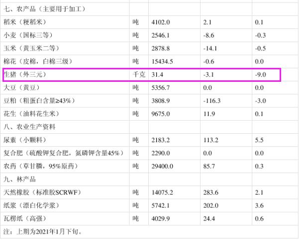 其中,生豬(外三元)價(jià)格為31.4千克/元,環(huán)比下降9%。