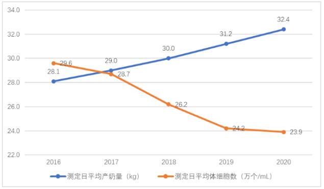 圖2 2016-2020年測定日平均產(chǎn)奶量及體細(xì)胞數(shù)