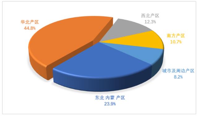 根據(jù)奶牛養(yǎng)殖地域的不同,全國劃分為東北和內(nèi)蒙古產(chǎn)區(qū)(黑龍江、吉林、遼寧、內(nèi)蒙古)、華北產(chǎn)區(qū)(河北、河南、山東、山西)、西北產(chǎn)區(qū)(陜西、甘肅、青海、寧夏、新疆、西藏)、南方產(chǎn)區(qū)(湖北、湖南、江蘇、浙江、福建、安徽、江西、廣東、廣西、海南、云南、貴州、四川)和大城市周邊產(chǎn)區(qū)(北京、天津、上海、重慶)。五個(gè)區(qū)域中,2020年華北產(chǎn)區(qū)的參測泌乳牛58.1萬頭,占全國參測牛數(shù)的44.8%,位居第一(詳見圖5)。
