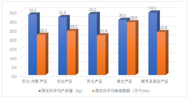 圖6 2020年不同產(chǎn)區(qū)測定日平均產(chǎn)奶量和體細(xì)胞數(shù)