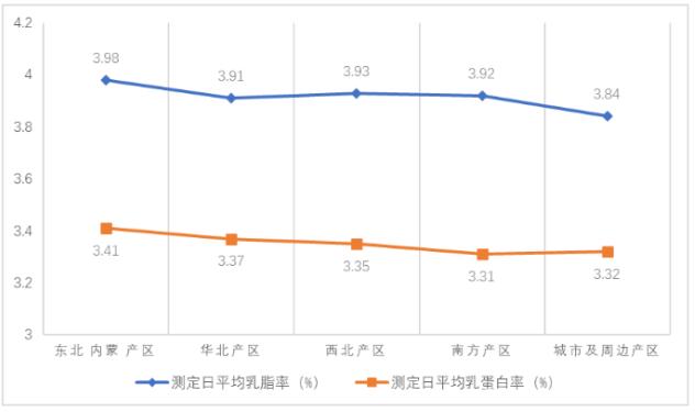 圖7 2020年不同產(chǎn)區(qū)測定日平均乳脂率和乳蛋白率