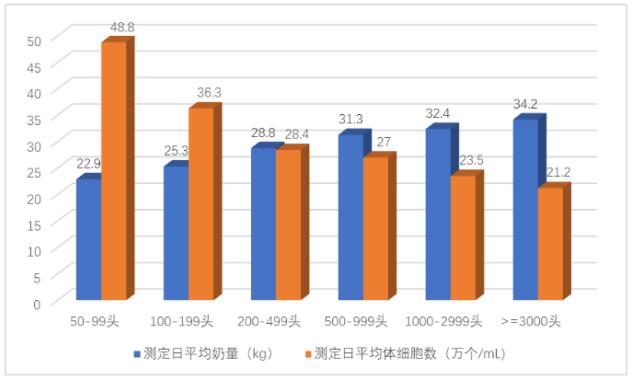 圖10 2020年不同泌乳牛規(guī)模場測定日平均產(chǎn)奶量和體細(xì)胞數(shù)