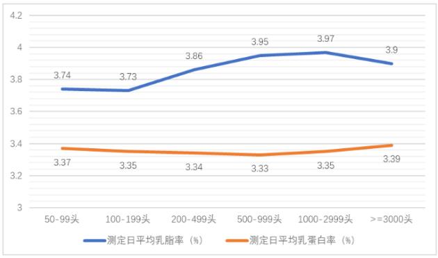 圖11 2020年不同泌乳牛規(guī)模場測定日平均乳脂率和乳蛋白率