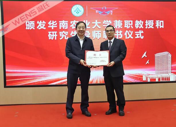 期間,王斌偉還代表華南農(nóng)業(yè)大學,給溫志芬董事長頒發(fā)華南農(nóng)業(yè)大學兼職教授和研究生導(dǎo)師聘書。
