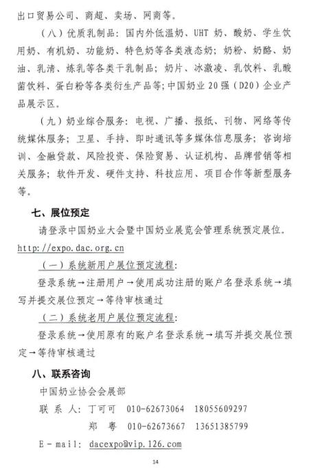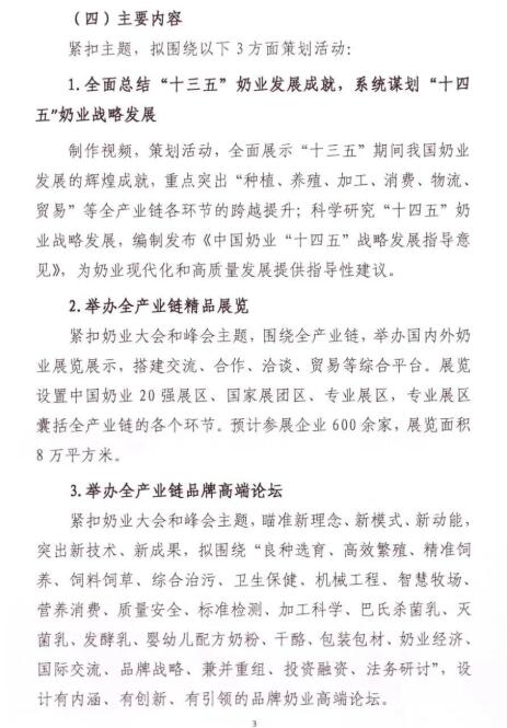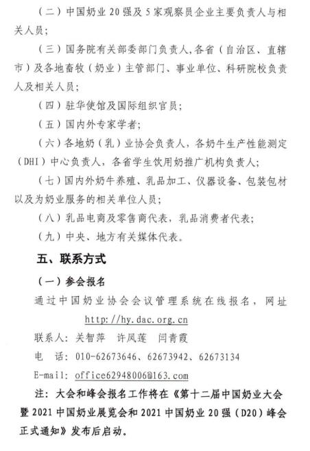“十四五”時期是我國在全面建成小康社會、實現(xiàn)第一個百年奮斗目標之后,乘勢而上開啟全面建設社會主義現(xiàn)代化國家新征程、向第二個百年奮斗目標進軍的第一個五年。2021年是“十四五”開局之年,在“兩個一百年”歷史交匯點上,為深入貫徹落實黨和國家領(lǐng)導人有關(guān)講話指示和十九屆五中全會精神,在農(nóng)業(yè)農(nóng)村部、安徽省人民政府的鼎力支持下,中國奶業(yè)協(xié)會將圍繞“全面總結(jié)‘十三五’奶業(yè)成就,系統(tǒng)謀劃‘十四五’戰(zhàn)略發(fā)展”,擬定于2021年7月中旬在合肥市召開第十二屆中國奶業(yè)大會暨2021中國奶業(yè)展覽會和2021中國奶業(yè)20強(D20)峰會,按照國家第十四個五年規(guī)劃總體要求,貫徹新發(fā)展理念,開創(chuàng)新發(fā)展格局,促進奶業(yè)全面振興,推動奶業(yè)高質(zhì)量發(fā)展,為全面建設現(xiàn)代化奶業(yè)開好局、起好步?,F(xiàn)將有關(guān)事宜通知如下: