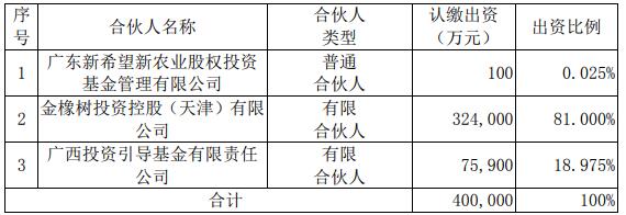 新希望3月13日公告,子公司廣東基金公司、金橡樹(shù)公司擬與廣西引導(dǎo)基金共同發(fā)起設(shè)立總規(guī)模人民幣40億元的廣西新希望生豬保供專(zhuān)項(xiàng)產(chǎn)業(yè)基金合伙企業(yè)(有限合伙),其中金橡樹(shù)公司認(rèn)繳出資金額32.4億元,出資比例為81%;廣西引導(dǎo)基金認(rèn)繳出資金額為7.59億元,出資比例為18.975%;廣東基金公司認(rèn)繳出資金額為100萬(wàn)元,出資比例為0.025%。