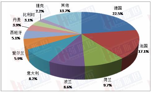 歐盟5個成員國牛奶產(chǎn)量超過1000萬噸,德國3254.9萬噸,同比增長0.3%,占歐盟總產(chǎn)量的22.5%;法國2466.0萬噸,同比增長0.5%,占17.1%;荷蘭1396.0萬噸,同比增長1.1%,占9.7%;波蘭1245.7萬噸,同比增長2.3%,占8.6%;意大利1189.5萬噸,同比下降0.6%,占8.2%。