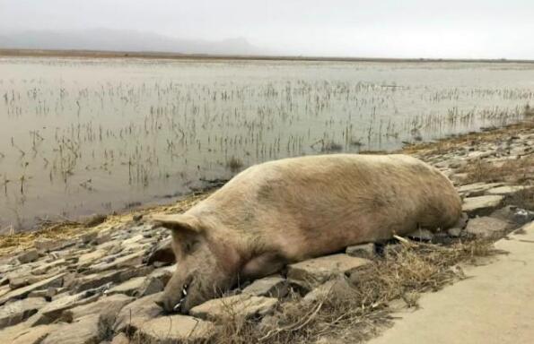 順著黃河大堤西行數(shù)公里后,在王愛召鎮(zhèn)德勝營子村解放營子社(村民小組)北側(cè)的黃河大堤內(nèi),看到更為驚人的一幕:在大堤通往主河道的土路西側(cè),白花花的死豬堆了一大堆,近前一數(shù),大約是12頭大豬尸體。