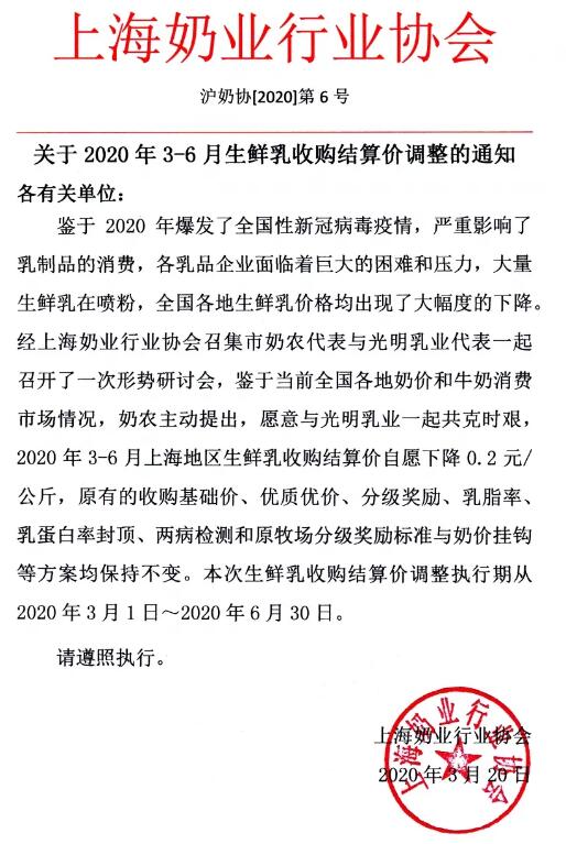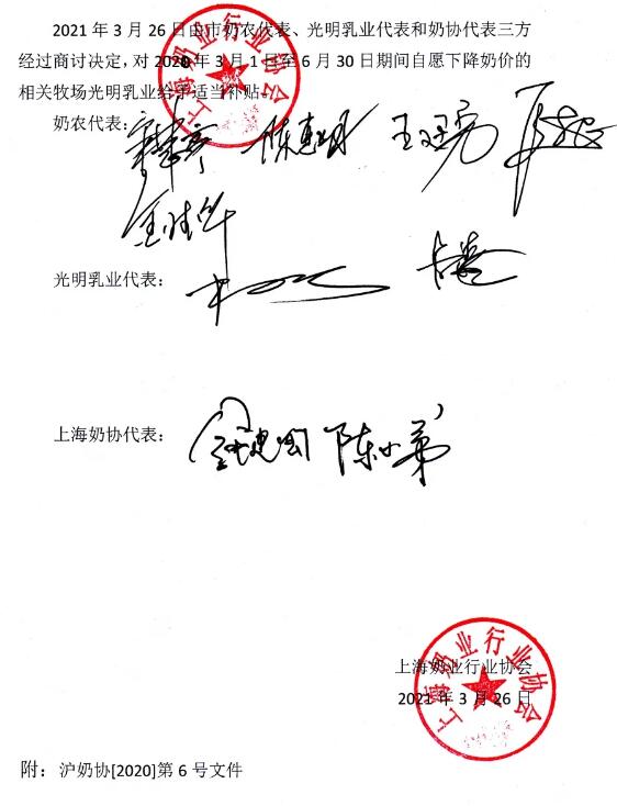 進入2021年受玉米、豆粕等飼料原料上漲影響,本市原料奶生產(chǎn)成本大幅上升,導致牧場經(jīng)營困難,為幫助牧場正常生產(chǎn)經(jīng)營,經(jīng)農(nóng)商雙方友好協(xié)商,在2020年疫情期間,按滬奶協(xié)【2020】第6號文件自愿下降奶價的相關(guān)牧場光明乳業(yè)給予適當補貼,補貼金額為2020年自愿降價總金額的50%,在2021年3-6月內(nèi)逐月兌現(xiàn),至6月底全部結(jié)束。2020年未涉及牧場不在此次補貼范圍內(nèi)。