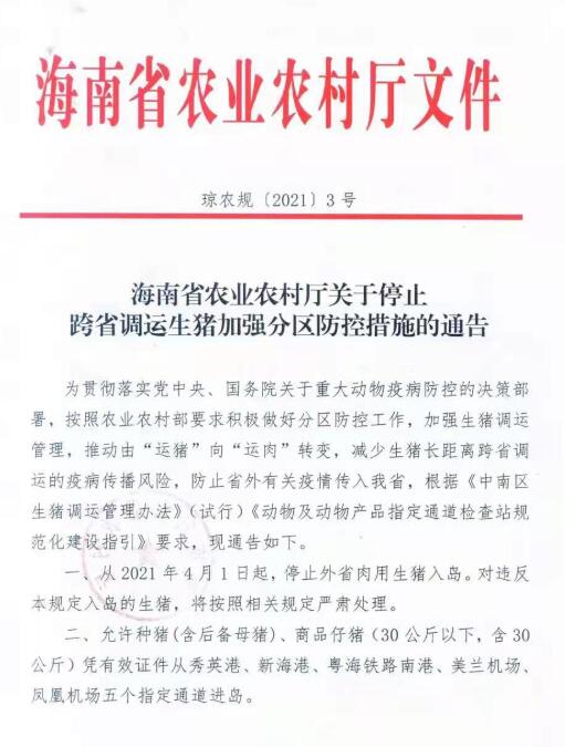 2021年4月1日,海南省農業(yè)農村廳印發(fā)《關于停止跨省調運生豬加強分區(qū)防控措施的通告》。自4月1日起,停止外省肉用生豬入島。允許種豬(含后備母豬)、商品仔豬(30公斤以下,含30公斤)憑有效證件從秀英港、新海港、粵海鐵路南港、美蘭機場、鳳凰機場五個指定通道進島。