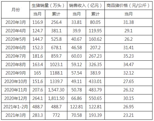 2021年1-3月份,公司共銷售生豬772.0萬(wàn)頭,其中商品豬611.8萬(wàn)頭,仔豬148.1萬(wàn)頭,種豬12.0萬(wàn)頭。