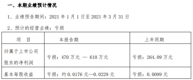 正虹科技4月15日發(fā)布業(yè)績預告,公司預計2021年第一季度歸屬于上市公司股東的凈虧損470萬元~610萬元,基本每股收益虧損約0.0176元~0.0229元。