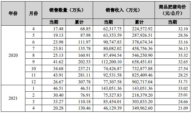 2021年1-4月銷售商品豬130.46萬頭,銷售收入349,962.60萬元,銷售均價29.29元/公斤(商品肥豬均價為27.21元/公斤),同比變動分別為89.48%、55.83%、-44.84%。