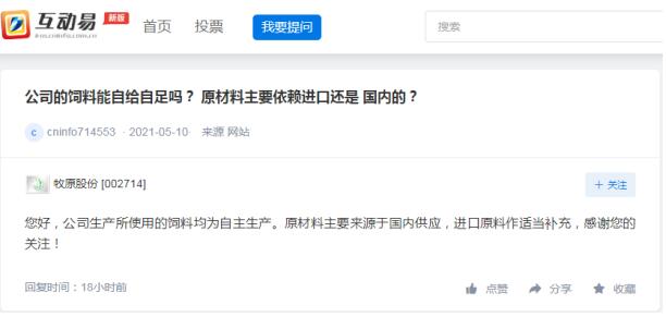 牧原股份近日在回復投資者提問時表示:公司生產(chǎn)所使用的飼料均為自主生產(chǎn)。原材料主要來源于國內(nèi)供應,進口原料作適當補充。