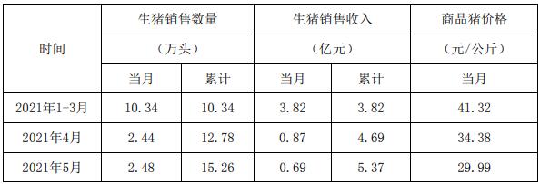 2021年5月份,公司商品豬銷售均價(jià)29.99元/公斤,其中:供港活大豬均價(jià)31.34元/公斤、內(nèi)銷商品肉豬均價(jià)19.29元/公斤。