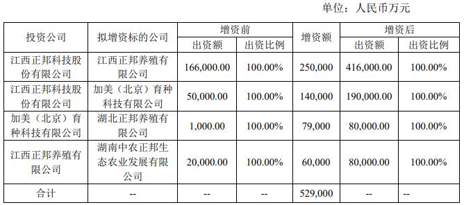 6月10日,正邦科技發(fā)布公告,擬以自有資金分別對(duì)下屬子公司江西正邦養(yǎng)殖有限公司(以下簡(jiǎn)稱“正邦養(yǎng)殖”)及加美(北京)育種科技有限公司(以下簡(jiǎn)稱“加美育種”)進(jìn)行增資,增資金額分別為人民幣250,000.00萬(wàn)元、人民幣140,000.00萬(wàn)元。