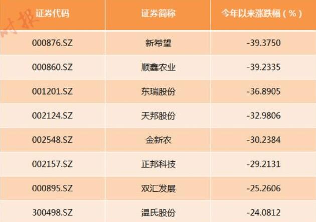 個股方面,據(jù)Wind統(tǒng)計,今年以來,新希望、順鑫農(nóng)業(yè)、東瑞股份等養(yǎng)豬企業(yè)個股跌幅已接近40%。