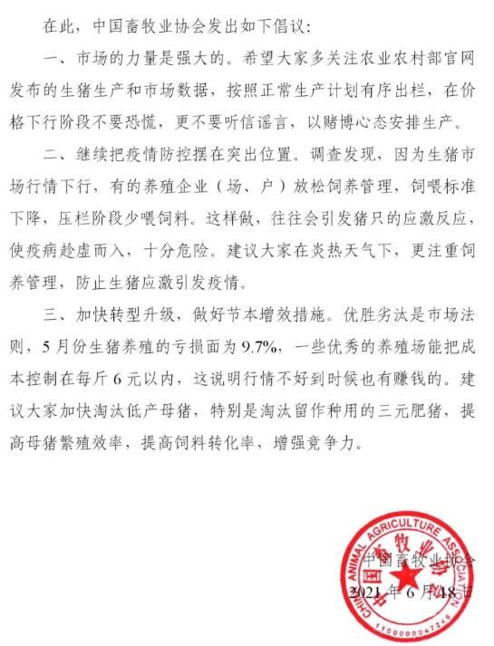 日前,中國(guó)畜牧業(yè)協(xié)會(huì)發(fā)布倡議書(shū),希望大家多關(guān)注農(nóng)業(yè)農(nóng)村部官網(wǎng)發(fā)布的生豬生產(chǎn)和市場(chǎng)數(shù)據(jù),不要恐慌不要聽(tīng)信謠言;繼續(xù)把疫情防控?cái)[在突出位置;建議養(yǎng)豬人加快淘汰低產(chǎn)母豬,特別是淘汰留作種用的三元肥豬,提高母豬繁殖效率,提高飼料轉(zhuǎn)化率,增強(qiáng)競(jìng)爭(zhēng)力。