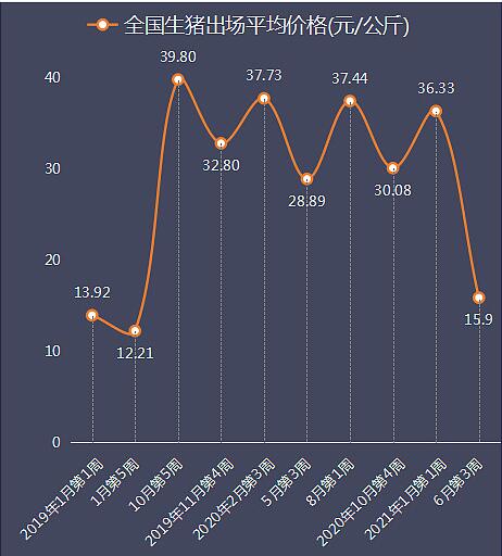 國(guó)家發(fā)改委網(wǎng)站最新披露的《2021年6月第3周豬料、雞料及蛋料比價(jià)》顯示:6月第3周全國(guó)生豬出場(chǎng)價(jià)格為15.85元/公斤,環(huán)比上周跌7.63%,跌幅依然不小。自2021年1月第1周上漲到本輪高點(diǎn)36.33元/公斤以來(lái),近期豬價(jià)具體走勢(shì)圖如下:
