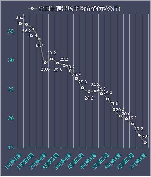 6月第3周的15.85元/公斤,較本輪高點(diǎn)36.33元/公斤跌去56.37%。