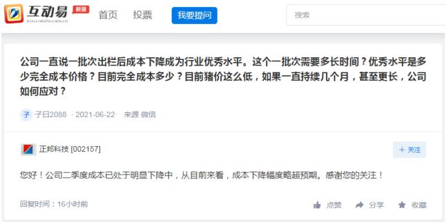 正邦科技近日在回復(fù)投資者提問時(shí)表示,公司二季度成本已處于明顯下降中,從目前來看,成本下降幅度略超預(yù)期。