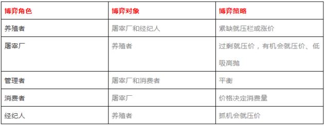 在中國(guó)的豬肉市場(chǎng)上,有五個(gè)角色在參與博弈,每個(gè)決策基于自己的角色和利益而動(dòng)作。