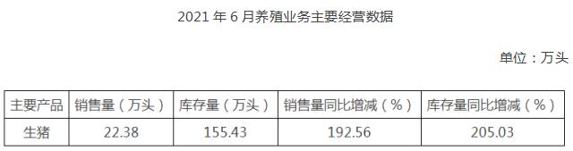 2021年6月末,公司生豬存欄155.43萬頭,較2020年6月末增長205.03%,較2020年12月末增長61.26%。