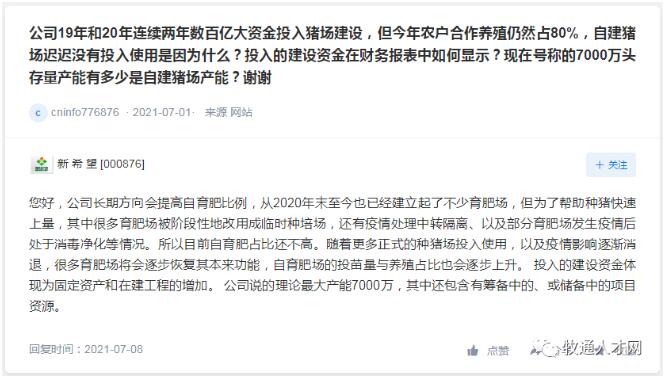 新希望解釋稱(chēng),為了幫助種豬快速上量,其中很多育肥場(chǎng)被階段性地改用成臨時(shí)種培場(chǎng),還有疫情處理中轉(zhuǎn)隔離、以及部分育肥場(chǎng)發(fā)生疫情后處于消毒凈化等情況。所以目前自育肥占比還不高。
