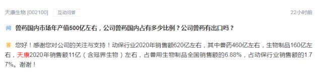天康生物近日在回復投資者提問時表示,動保行業(yè)2020年銷售額620億左右,其中獸藥460億左右,生物制品160億左右,天康2020年銷售額11億(含冠界生物)左右,占獸用生物制品全國銷售額的6.88%,占動保行業(yè)銷售額的1.77%。