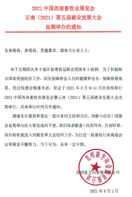由于近期國內(nèi)多個地區(qū)新增新冠肺炎疫情本土病例,為了積極配合國家疫情防控工作,切實(shí)保障參會人員的健康和安全,保障參展效果。經(jīng)過組委會慎重考慮,原定于2021年8月9-11日在昆明舉行2021中國西南畜牧業(yè)展覽會暨云南(2021)第五屆豬業(yè)發(fā)展大會改期舉行,具體舉行時間另外通知。