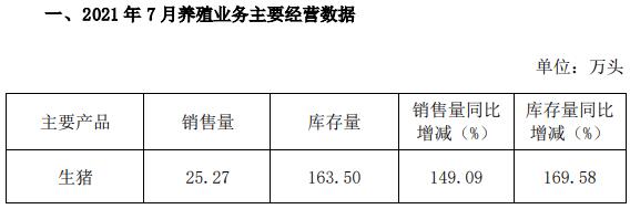 2021年1-7月,公司累計(jì)銷(xiāo)售生豬151.19萬(wàn)頭,銷(xiāo)售量同比增長(zhǎng)176.92%。