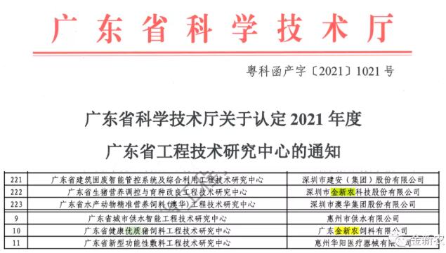 近日,根據《廣東省科學技術廳關于認定2021年度廣東省工程技術研究中心的通知》,由深圳市金新農科技股份有限公司組建的“廣東省生豬營養(yǎng)調控與育種改良工程技術研究中心”及子公司廣東金新農飼料有限公司組建的“廣東省健康優(yōu)質豬飼料工程技術研究中心”同期成功通過認定。金新農股份在生豬育種、飼料營養(yǎng)等專業(yè)領域的科技創(chuàng)新能力和研發(fā)實力獲得廣東省科學技術廳的高度肯定!