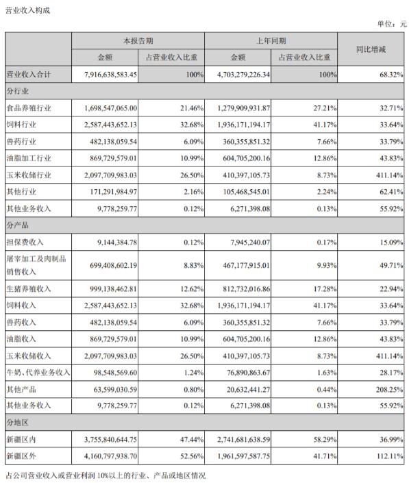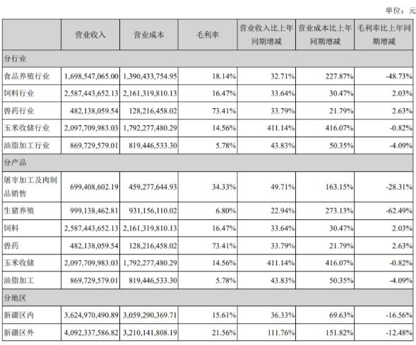 報(bào)告期內(nèi),公司綜合毛利率為18.13%,同比下降了13.95個(gè)百分點(diǎn)。其中:制藥產(chǎn)品毛利率為73.41%,同比上升了2.63個(gè)百分點(diǎn);飼料產(chǎn)品毛利率為16.47%,同比上升了2.03個(gè)百分點(diǎn);屠宰加工及肉制品銷售業(yè)務(wù)毛利率為34.33%,同比下降了28.31個(gè)百分點(diǎn);生豬養(yǎng)殖業(yè)務(wù)毛利率為6.80%,同比下降了62.49個(gè)百分點(diǎn);油脂加工業(yè)務(wù)毛利率為5.78%,同比下降了4.09個(gè)百分點(diǎn);玉米收儲(chǔ)業(yè)務(wù)毛利率為14.56%,同比下降了0.82個(gè)百分點(diǎn)。