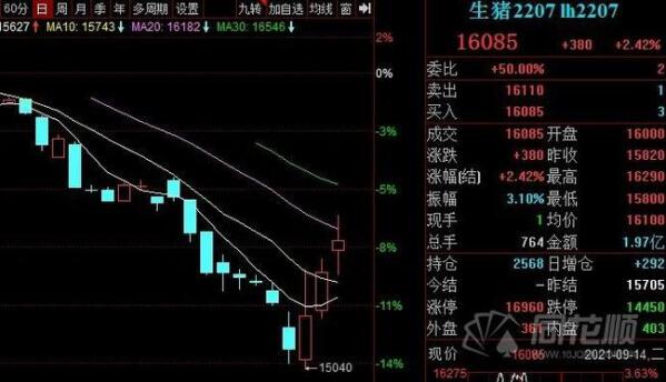 以生豬2205合約為例,近三日從14580元/噸一度反彈至15660元/噸,拉升幅度超7%!與此同時,生豬2207合約同步拉升,低位大漲超8%。在05、07合約大漲的同時,成交量及持倉量開始出現(xiàn)明顯增長。
