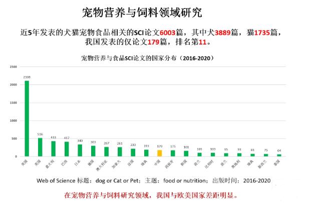 而我國在寵物營養(yǎng)與飼料領(lǐng)域的研究與歐美國家差距明顯,2016-2020年發(fā)表有關(guān)寵物食品的SCI論文僅為179篇,而美國共發(fā)表2108篇。寵物營養(yǎng)與飼料研究參與面亦有待提高,目前只有中國科學(xué)院、華南農(nóng)業(yè)大學(xué)、中國農(nóng)業(yè)大學(xué)等少數(shù)和科研機構(gòu)開展相關(guān)研究。此外,研發(fā)基礎(chǔ)薄弱、功能聲稱缺乏科學(xué)依據(jù)、專業(yè)人才嚴(yán)重缺乏等問題。
