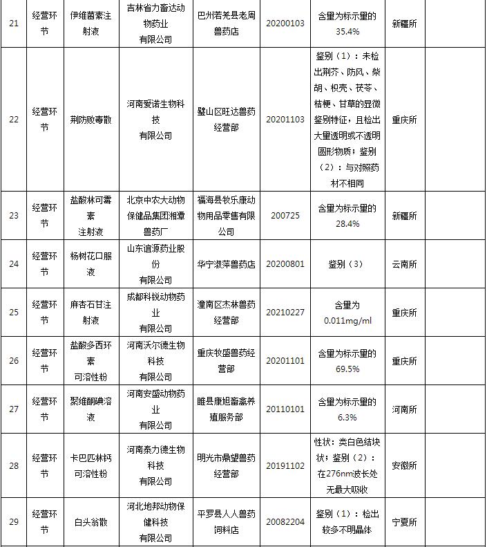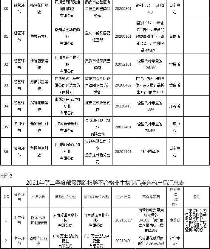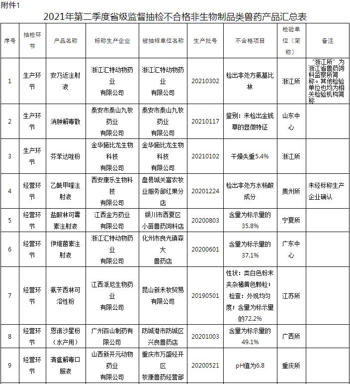 附件:1. 2021年第二季度省級監(jiān)督抽檢不合格非生物制品類獸藥產品匯總表