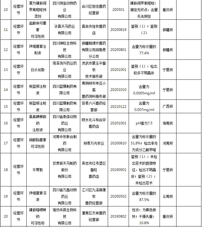 (五)惠州叁玖新獸藥開發(fā)有限公司(全年獸藥質量通報產品含量低于80%累計2批次以上)。