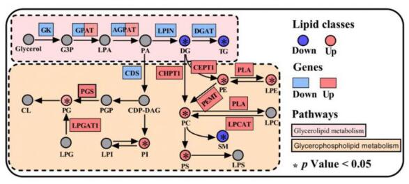 利用團(tuán)隊(duì)前期建立的基于液相色譜-質(zhì)譜法的脂質(zhì)組學(xué)(Li et al,2021,Journal of Food Science)以及聯(lián)合轉(zhuǎn)錄組學(xué)技術(shù),發(fā)現(xiàn)驢肉肌內(nèi)脂肪富含磷脂和多不飽和脂肪酸(PUFA),且PUFA優(yōu)先分布在甘油三酯的sn-1位置以及磷脂酰膽堿和磷脂酰乙醇胺的sn-2位置;這可能由于38個(gè)高含量脂質(zhì)分子(37個(gè)甘油磷脂和1個(gè)鞘磷脂)以及磷脂合成相關(guān)基因在肌肉中高表達(dá)所致;甘油脂和甘油磷脂代謝被認(rèn)為是調(diào)控肌內(nèi)脂肪的關(guān)鍵途徑。本研究成果為清晰認(rèn)識(shí)肌內(nèi)脂肪及其精準(zhǔn)調(diào)控提供理論依據(jù),對(duì)提高驢肉中肌內(nèi)脂肪含量,改善肉的食用品質(zhì)和價(jià)值具有重要實(shí)際意義。