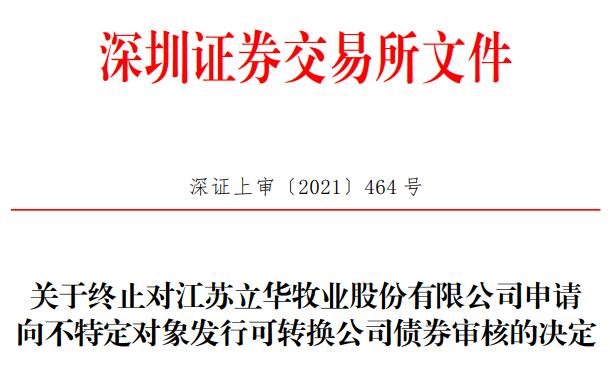 立華股份10月21日公告,公司收到深交所出具的《關(guān)于終止對江蘇立華牧業(yè)股份有限公司申請向不特定對象發(fā)行可轉(zhuǎn)換公司債券申請審核的決定》。深交所決定終止對公司申請向不特定對象發(fā)行可轉(zhuǎn)換公司債券事項的審核。