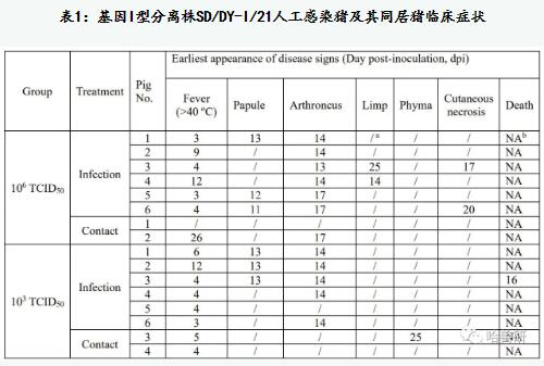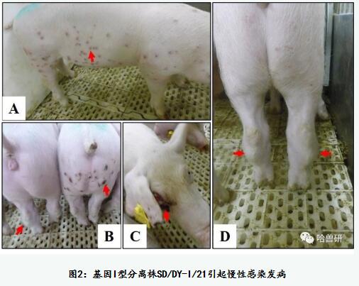 動(dòng)物試驗(yàn)表明,SD/DY-I/21感染豬表現(xiàn)為低致病力,具有高效傳播能力,可引起壞死性皮膚損傷和關(guān)節(jié)腫脹等慢性臨床癥狀(表1和圖2)。以106TCID50劑量感染6頭SPF豬,感染后第3天起陸續(xù)出現(xiàn)不同程度的間歇性發(fā)熱;第11天起3頭豬頸、耳部皮膚出現(xiàn)丘疹并發(fā)展為后腹部和全身性丘疹;第13天陸續(xù)出現(xiàn)關(guān)節(jié)炎,其中2頭豬發(fā)展到跛行(表1);感染后第5天起口拭子檢出病毒DNA,第7天起肛拭子與血液中檢出病毒DNA(圖3);感染后28天觀察期內(nèi)所有豬存活。以103TCID50劑量感染6頭SPF豬,感染后第3天起陸續(xù)出現(xiàn)間歇發(fā)熱,第13天有3頭豬出現(xiàn)皮膚丘疹;第14天陸續(xù)有5頭出現(xiàn)關(guān)節(jié)炎;第16天一頭豬發(fā)病死亡,其余28天觀察期內(nèi)存活(表1);口拭子、肛拭子和血液分別于感染后第9、第11和第7天檢出病毒DNA(圖3);檢測組織中的病毒載量,病死豬顯著高于安樂死存活豬;所有存活豬的組織均檢出病毒DNA,其中脾臟、肺臟、腎上腺、骨髓和某些淋巴結(jié)中病毒DNA載量較高。