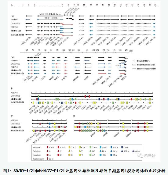 國家非洲豬瘟專業(yè)實(shí)驗(yàn)室科研人員在流行病學(xué)監(jiān)測及病原學(xué)研究過程中,從山東和河南兩地豬場臨床發(fā)病豬樣品分離出兩株基因 I 型非洲豬瘟病毒SD/DY-I/21和HeN/ZZ-P1/21,兩株病毒均無血吸附活性。全基因組進(jìn)化分析表明,這兩株病毒與上世紀(jì)葡萄牙分離的基因I型低致死毒株NH/P68 和 OURT88/3 高度相似,與歐洲及非洲早期分離的基因I型強(qiáng)毒株L60和Benin 97存在較大差異(圖1)。SD/DY-I/21和HeN/ZZ-P1/21盡管全基因組序列高度相似,但部分基因存在明顯突變差異,提示二者有可能屬于不同的入侵來源(圖1)。NH/P68 于1968年從葡萄牙的一頭具有慢性癥狀的家豬中分離, OURT88/3于1988年從葡萄牙豬場的軟蜱中分離。葡萄牙和西班牙已于九十年代徹底根除非洲豬瘟,目前NH/P68和OURT88/3僅保存于國外少數(shù)幾個(gè)實(shí)驗(yàn)室,限于嚴(yán)格生物安全條件下開展相關(guān)基礎(chǔ)與應(yīng)用研究。此類病毒通過何種途徑侵入我國,有待進(jìn)一步了解。