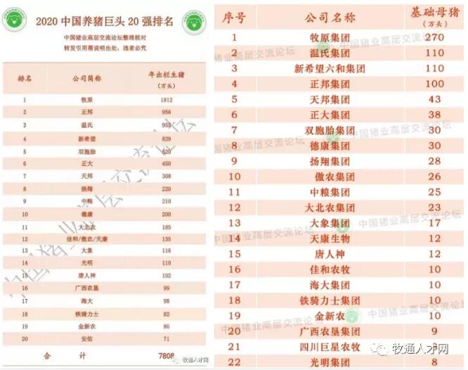 本次排名前22強(qiáng)(基礎(chǔ)母豬排名)與2020年22強(qiáng)(年出欄量排名)比較,可以看出:明年、后年22強(qiáng)排行榜變化不大,安佑可能被擠出22強(qiáng),巨星農(nóng)牧可能擠進(jìn)22強(qiáng)。
