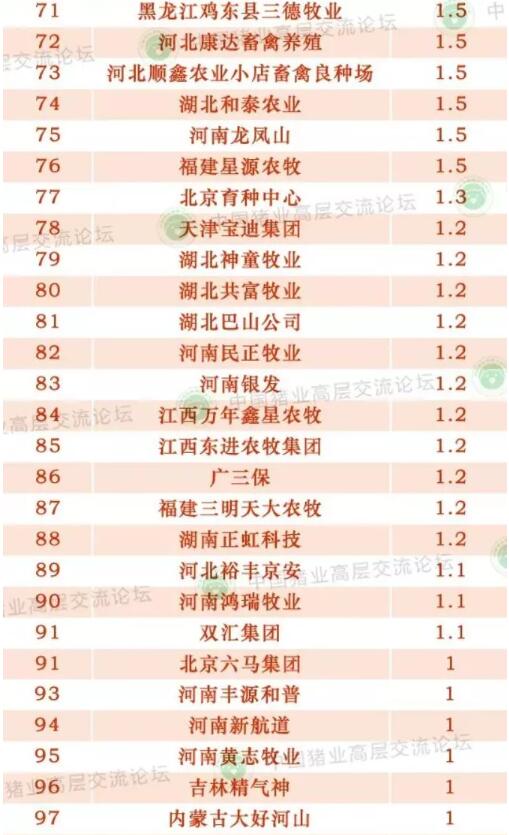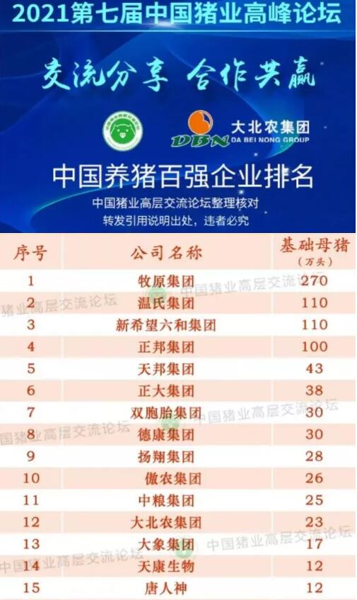 近日,一份由中國豬業(yè)高層交流論壇整理發(fā)布的“中國養(yǎng)豬百強(qiáng)企業(yè)”排名重磅公布。