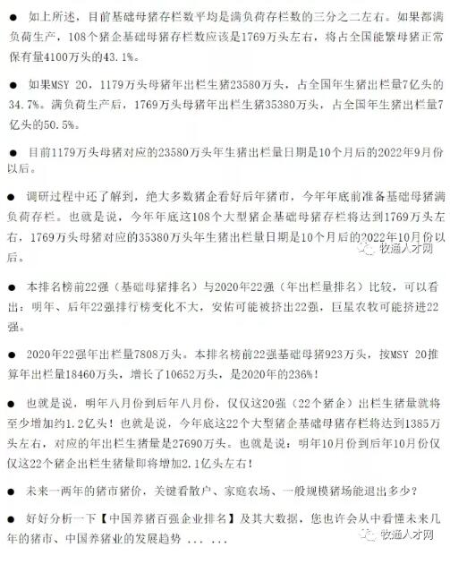 也就是說,今年年底這108個(gè)大型豬企基礎(chǔ)母豬存欄將達(dá)到1769萬頭左右,1769萬頭母豬對應(yīng)的35380萬頭年生豬出欄量日期是10個(gè)月后的2022年10月份以后。
